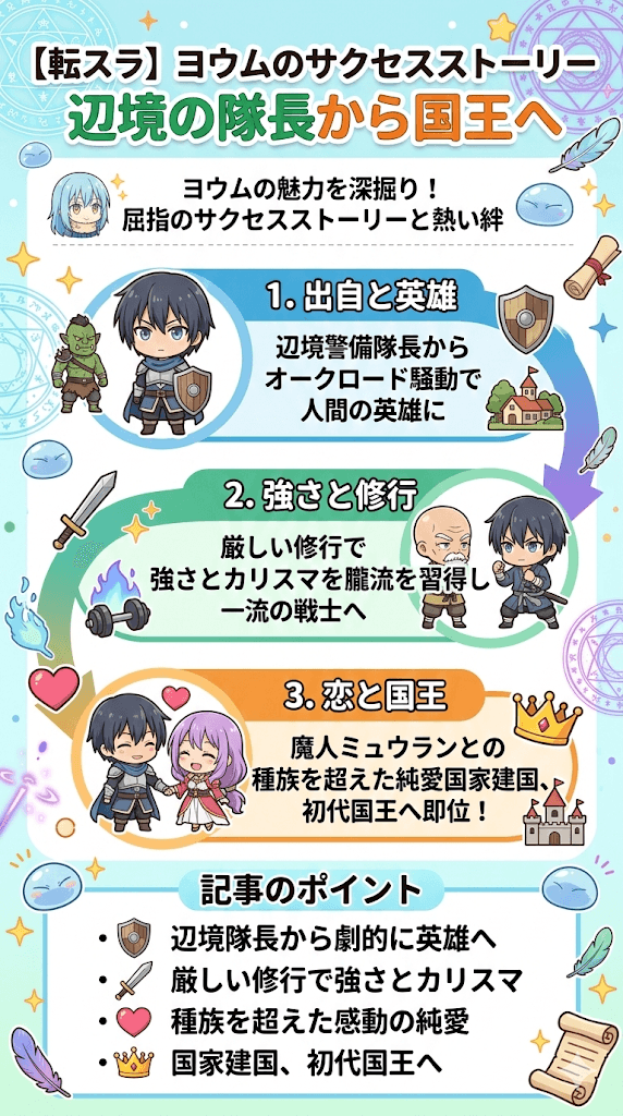 転スラのヨウムというキャラクターについて深く知りたいと考えている方は多いのではないでしょうか。 辺境の警備隊長から始まり、やがて一国の王へと登り詰める彼の物語は、作中でも屈指のサクセスストーリーとして描かれています。 また、魔人ミュウランとの種族を超えた純愛や、頼れる仲間たちとの熱い絆など、彼の周辺には胸を打つ魅力的なエピソードが数多く存在しています。 本記事では、そんな彼の出自から過酷な修行による能力の向上、そして旧体制の崩壊を経て新国家建国に至るまでの壮大な軌跡を詳しく紐解いていきます。 記事のポイン ...