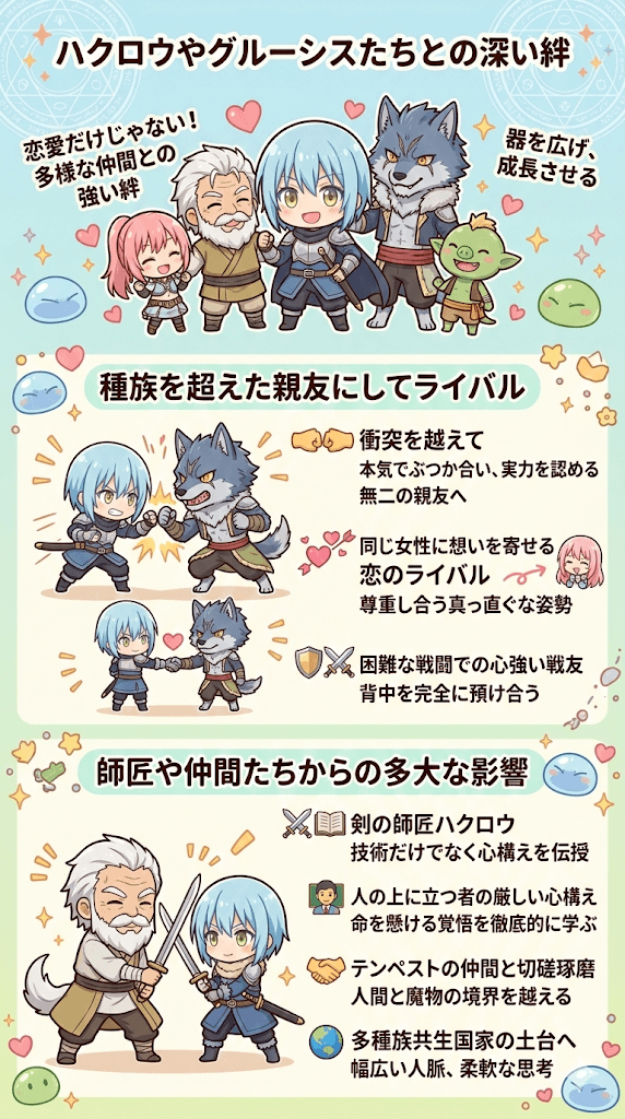 さらに、テンペストのゴブタをはじめとする多種多様な魔物の仲間たちと一緒に汗を流し、切磋琢磨することで、彼は人間と魔物という種族の境界を越えた非常に幅広い人脈を築き上げます。