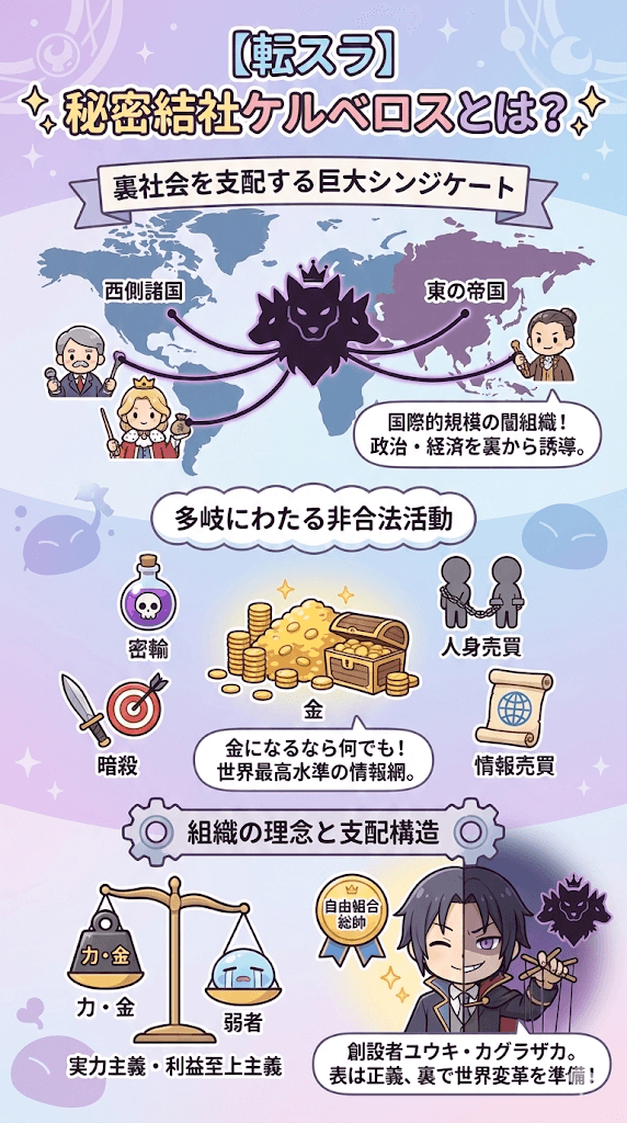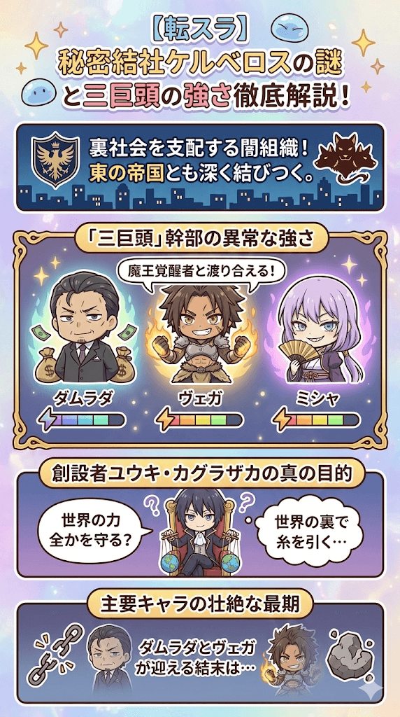 『転生したらスライムだった件』に登場する「秘密結社ケルベロス」は、単なる盗賊団や犯罪組織とは一線を画す、国際的な規模を持つ巨大な闇の組織です。