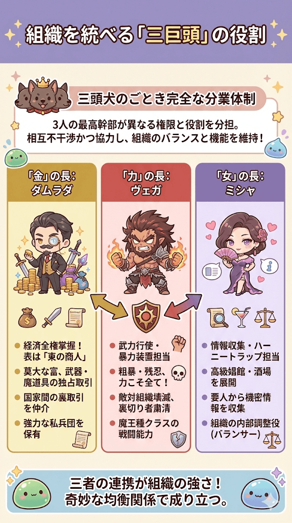 その名の通り、組織は「三巨頭(サンキョトウ)」と呼ばれる3人の最高幹部によって統率されており、それぞれが異なる権限と役割を分担することで、組織全体のバランスと機能を維持しています。
