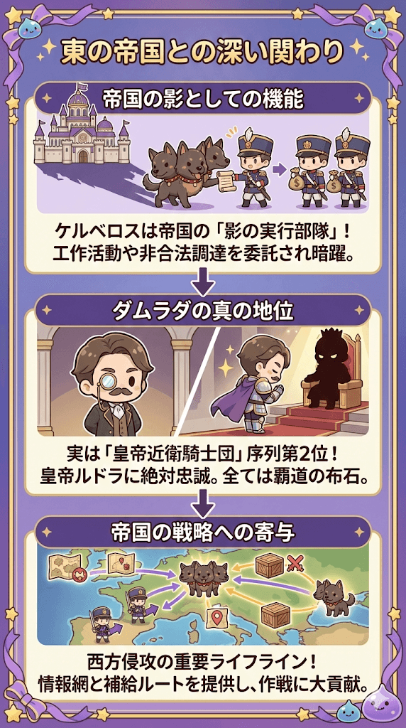 帝国が西方諸国へ侵攻を開始した際、ケルベロスが長年かけて築き上げた情報網と補給ルートは、帝国軍にとって極めて重要なライフラインとなりました。
