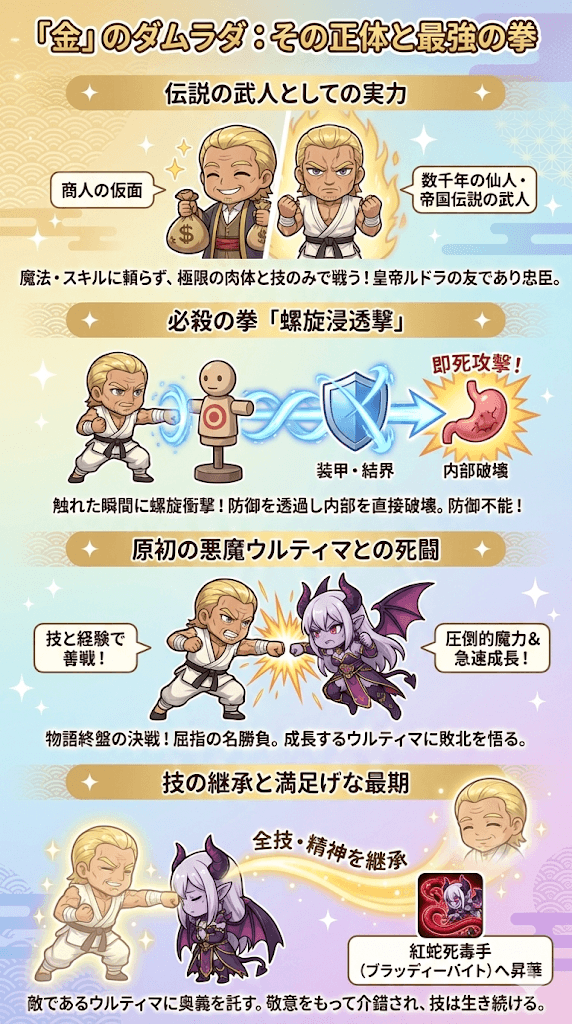 ダムラダの技は後にウルティマ独自の「紅蛇死毒手(ブラッディーバイト)」として昇華され、彼の生きた証は最強の悪魔の中に残り続けることとなりました。