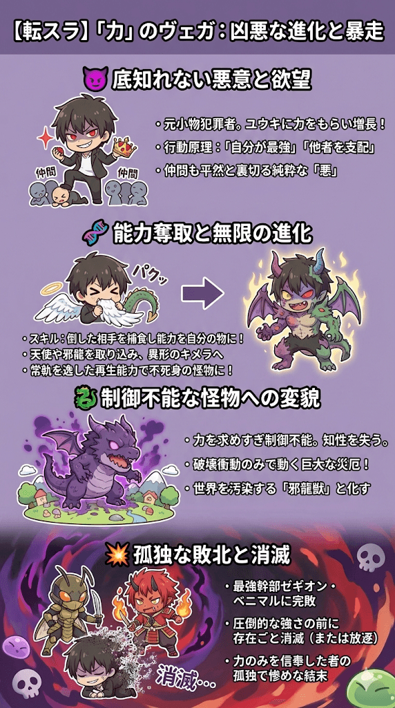 最終的にヴェガは、リムル配下の最強幹部であるゼギオンや、覚醒したベニマルといった強者たちによって引導を渡されます。