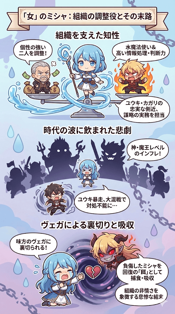 書籍版の展開において、ミシャは最終的に味方であるはずのヴェガによって裏切られるという悲惨な最期を迎えます。