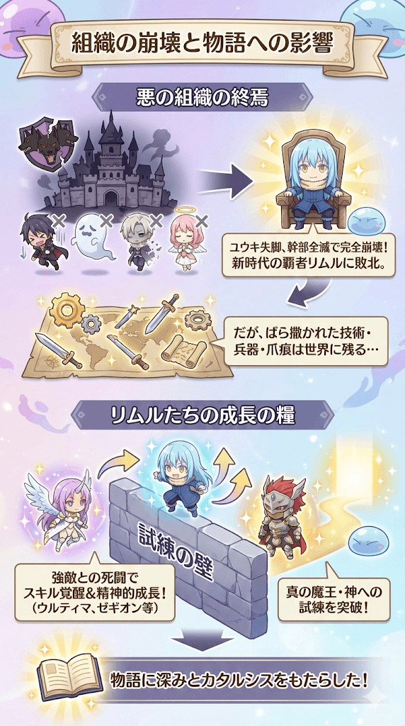 - 組織の崩壊は、リムルたちのさらなる成長の糧となり、物語の完結に向けた重要な転換点となった