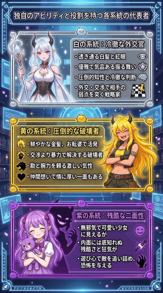 | 白 | 高貴、冷徹、知的、白髪に真紅の瞳 | 外交交渉、戦略立案、冷酷な判断 |