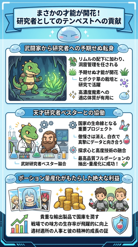 これまで武の力のみを重んじていた戦士が、裏方である研究職において国を支える大黒柱となったことは、適材適所を見抜くリムルの采配の妙を示すものです。