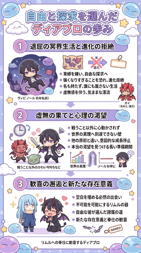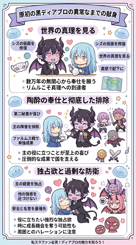 • ディアブロは異常な献身でリムルを支え自身の探求心を満たそうとしている