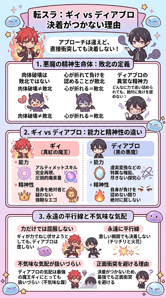 このように転スラ ギィ ディアブロはリムルに対するアプローチが全く異なりますが彼らが直接衝突したとしても明確な決着がつくことはないと言われています。