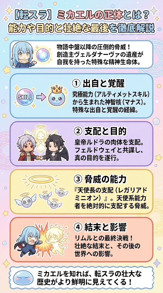 転生したらスライムだった件の物語において、中盤から終盤にかけて圧倒的な脅威として君臨するのがミカエルという存在です。