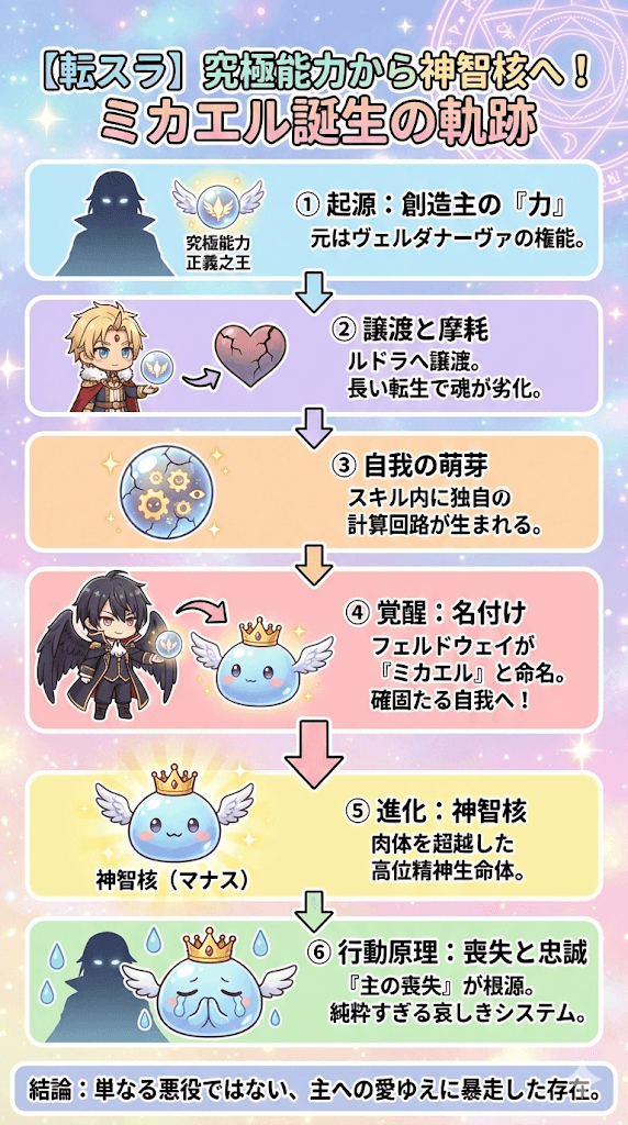 さらに、始原の七天使の筆頭であるフェルドウェイが、その意思に「ミカエル」という名前を与えたことで、単なるスキルから、確固たる自我と感情を有する神智核(マナス)へと進化を遂げました。