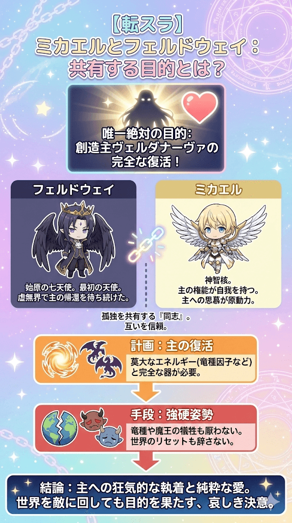 フェルドウェイはミカエルを「主の力の化身」として聖別し、ミカエルはフェルドウェイを「自分に名前を与えた理解者」として信頼しています。彼らの計画は極めて壮大かつ非情です。