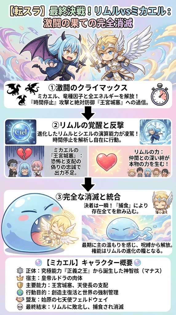 物語の集大成とも言えるリムルとミカエルの直接対決は、次元の壁を越えた凄まじい決戦となりました。