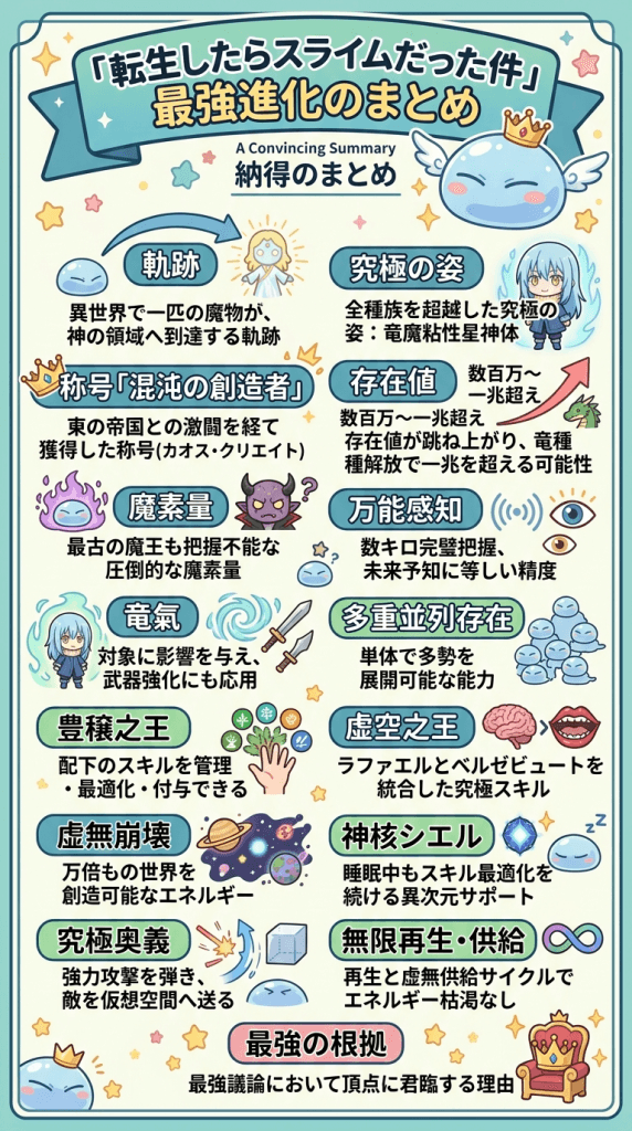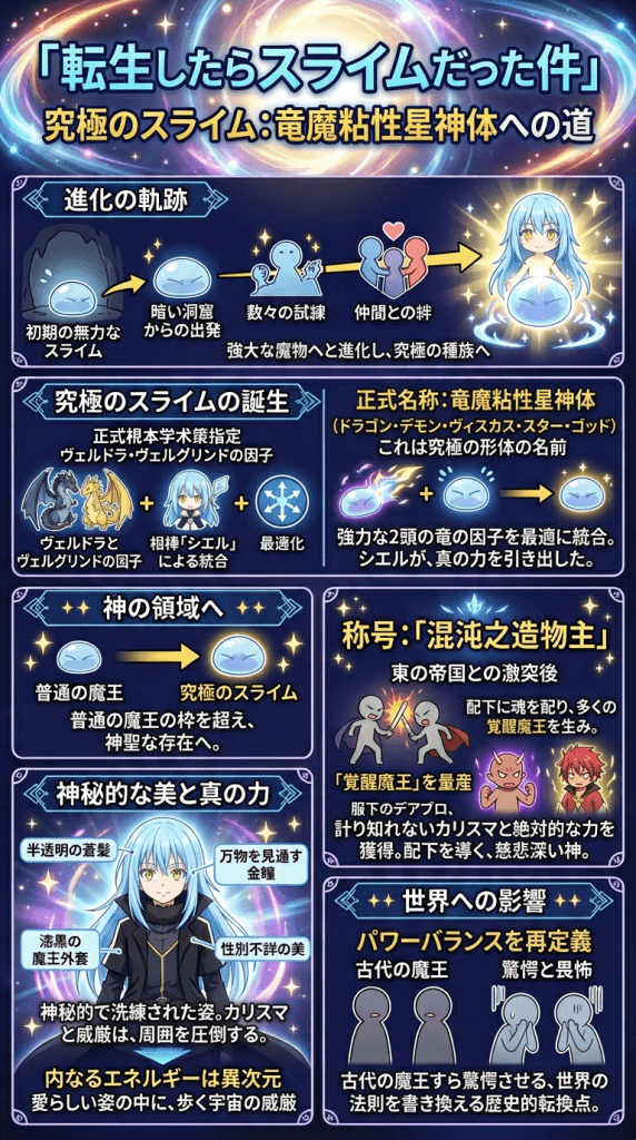 かつて一匹の非力な魔物として薄暗い洞窟に降り立った主人公は、数々の出会いと別れ、そして血を洗うような激しい試練を乗り越え、ついに究極の種族へと進化を遂げました。