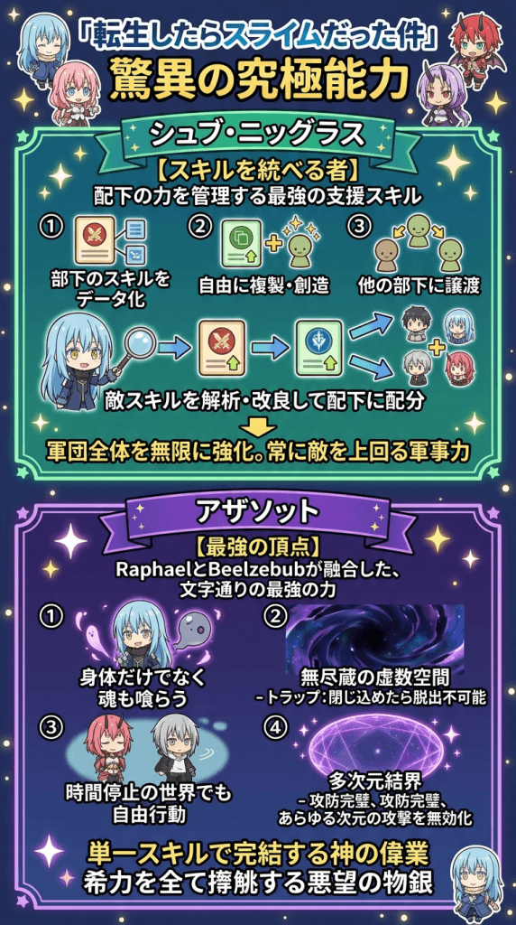 中核の一つであるシュブニグラトは、配下たちが持つ多種多様なスキルをデータとして保存し、自由な複製や新たな創造、さらには他者への贈与まで行えるという、スキルの包括的な管理に特化した前代未聞の権能を持っています。