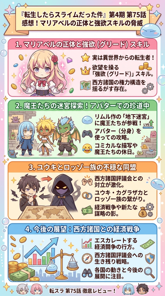 【転スラ】4期75話 感想 マリアベル 正体について深く知りたいと検索している読者の方へ向けて、転生者としての過去や魔王たちの意外な休日といった視点から、今回のエピソードを詳細に紐解いていきます。