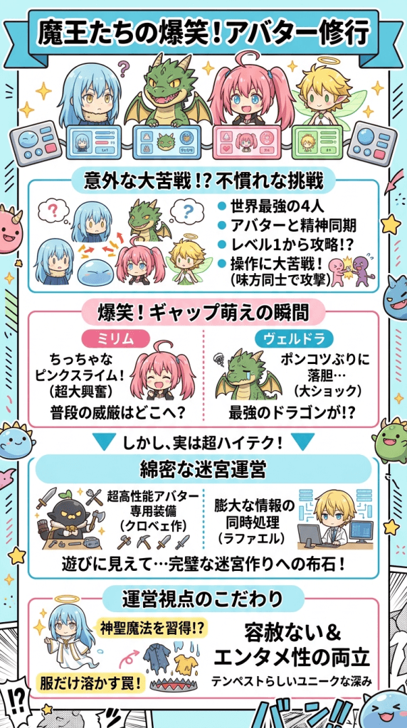 リムル、ヴェルドラ、ミリム、ラミリスという、世界最高峰の戦闘力を誇る4人が、アバターに精神を同期させてレベル1の状態から迷宮攻略に挑む姿は、まさに神々の遊びといえる光景です。