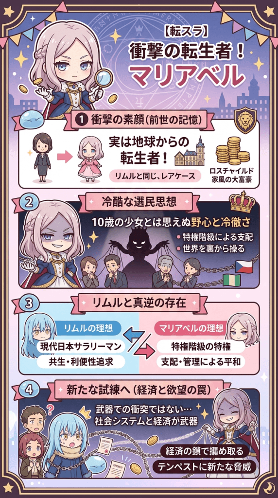 ロッゾ一族の末娘として君臨するマリアベルが、実はリムルと同じく地球からの転生者であったという事実は、多くの視聴者に強烈な衝撃を与えました。
