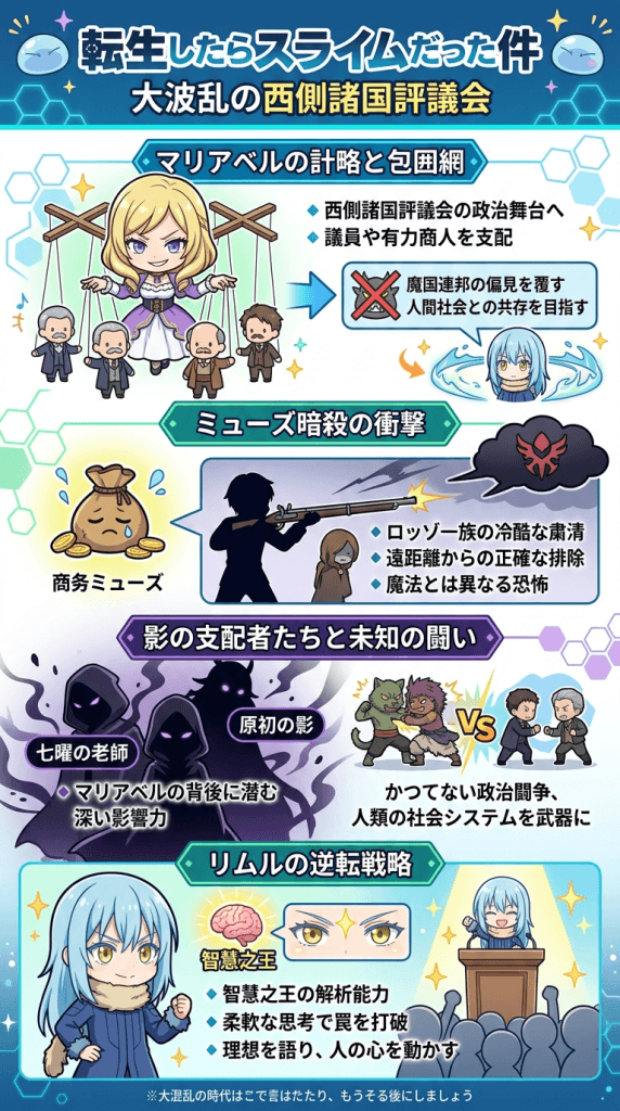 これまでリムルが戦ってきた魔王たちの領域とは異なり、人間たちの社会制度そのものを武器にする戦いは、リムルにとっても未知の領域です。