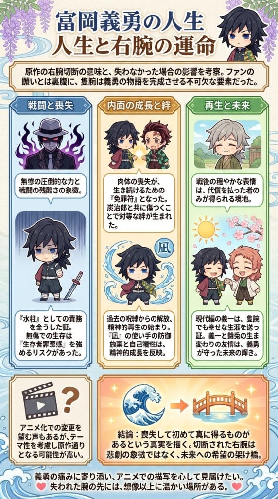 この記事では、「冨岡義勇 腕 切られなくなる」という検索キーワードを出発点に、原作での展開の意味と、もし腕が失われなかった場合の物語への影響について深く考察してきました。