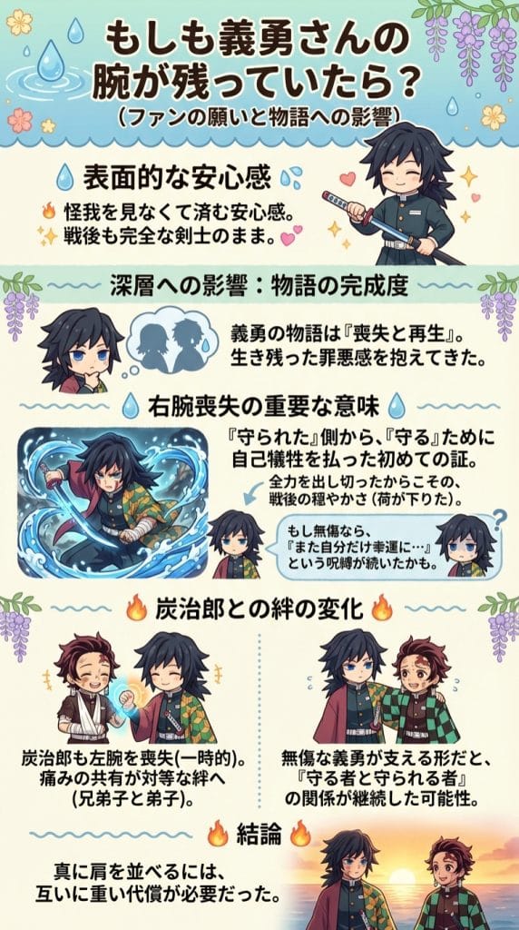 一方で、もし仮に義勇の腕が残る展開になった場合、それは単なるファンサービス以上の意味を持つことになります。