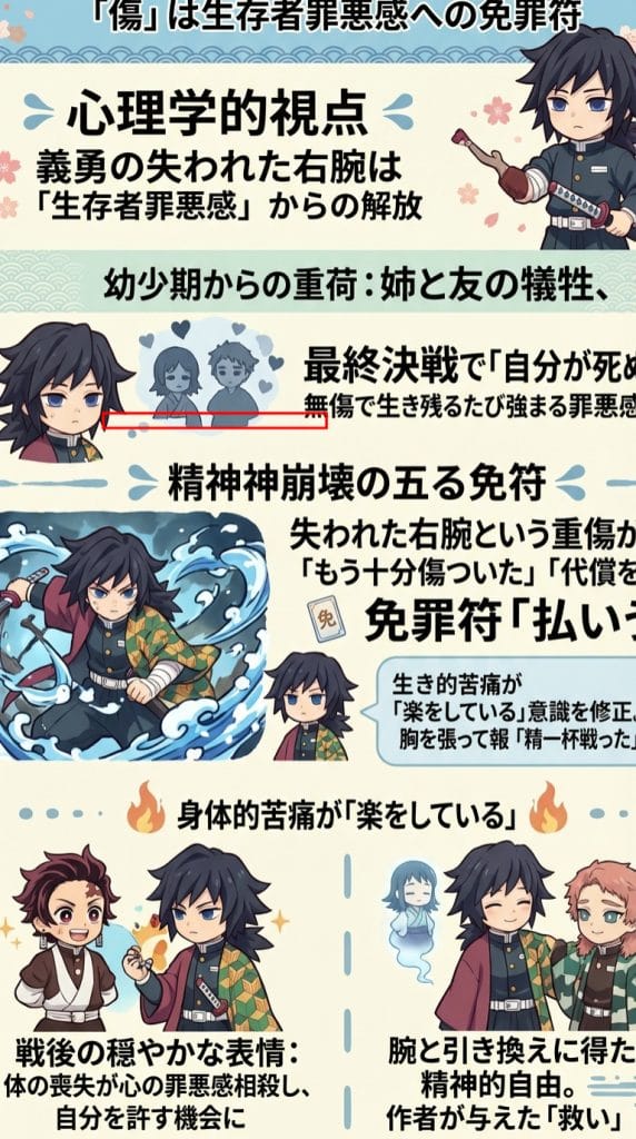 心理学的な観点から見ると、義勇の右腕欠損は「サバイバーズ・ギルト(生存者の罪悪感)」からの解放を促す重要な要素として機能しています。