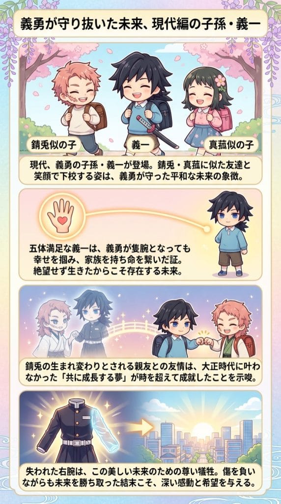 右腕を失った義勇が、それでも「生きること」を選択し、人並みの幸せを掴んだからこそ、現代の平和な日常の中に彼の血脈が息づいているのです。