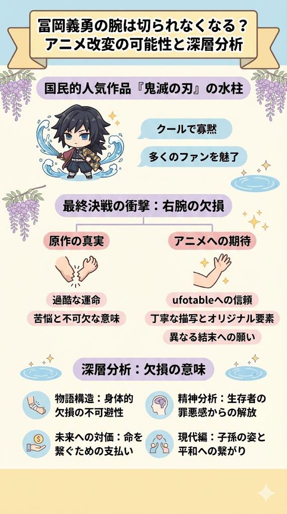 特に、最終決戦における「右腕の欠損」という衝撃的な展開に対し、これから公開されるアニメ版では「冨岡義勇 腕 切られなくなる」という異なる結末を迎えるのではないか、あるいはそうなってほしいという切実な願いを持つ読者が少なくありません。