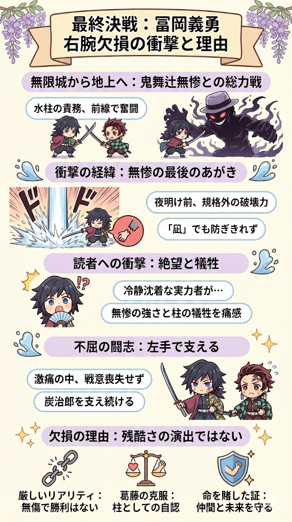 • 冨岡義勇の右腕欠損は、無惨の圧倒的な力の証明であり、戦いの過酷さを象徴する描写である
