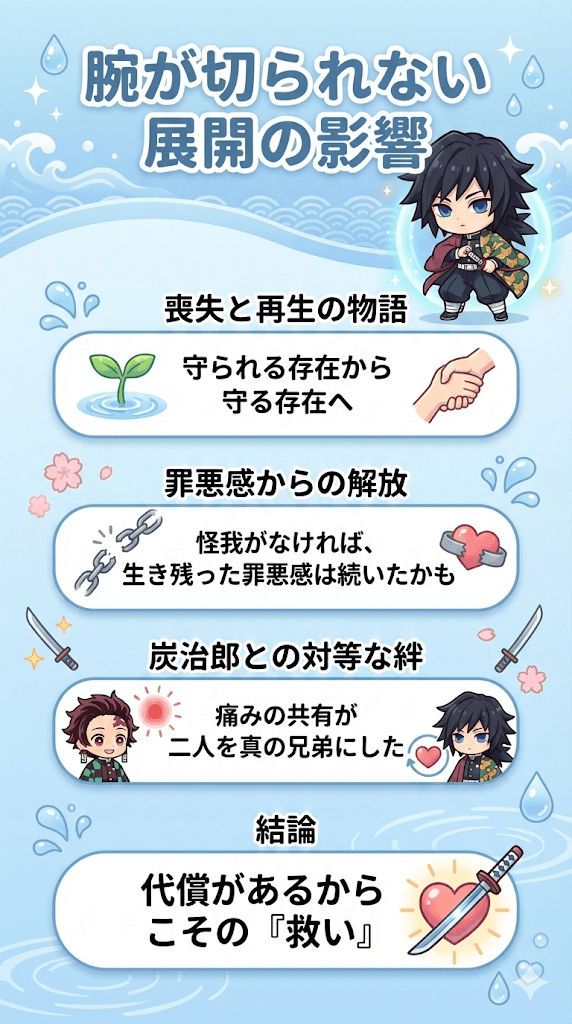 しかし、同時に原作で描かれた「欠損」には、冨岡義勇という一人の剣士が抱え続けてきた苦悩と、それを乗り越えるための不可欠な意味が込められていたという見方も存在します。